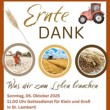 Am Sonntag, 5. Oktober, feiern wir das Erntedankfest in St. Lamberti - für Groß und Klein um 11.00 Uhr - mit der Landjugend, den Landfrauen und dem…