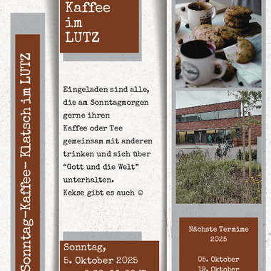 Sonntag, 05.10.2025 1. Termin für den Sonntag-Kaffee-Klatsch im LUTZ. von 9.30 - 11.00 Uhr. Eingeladen, sind Menschen, die gerne ihren Sonntagskaffee…