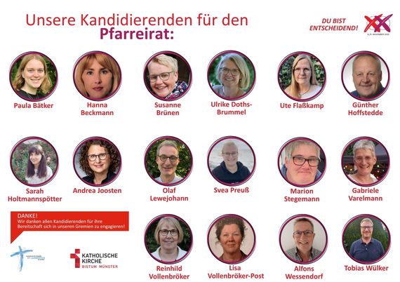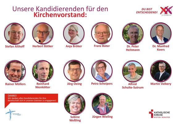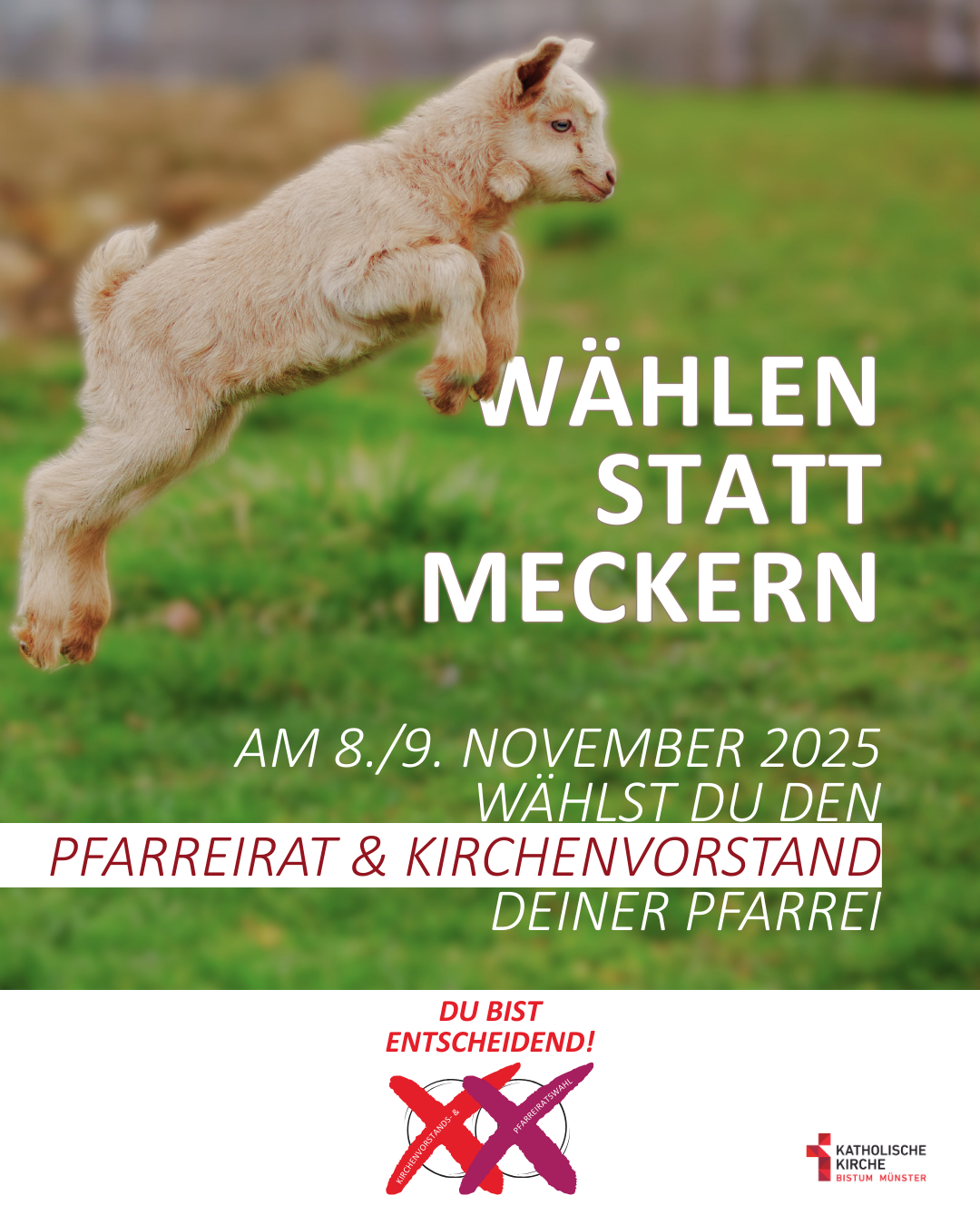 Am 8./9. November finden die Wahlen zum Kirchenvorstand und Pfarreirat unserer Pfarrei statt. Die Wahlen finden als Urnenwahl in den Kirchen sowie im Pfarrzentrum St. Liudger (LUTZ) statt. Briefwahl ist auf Antrag möglich; melden Sie sich einfach (per Telefon, Mail oder persönlich) im Pfarrbüro.