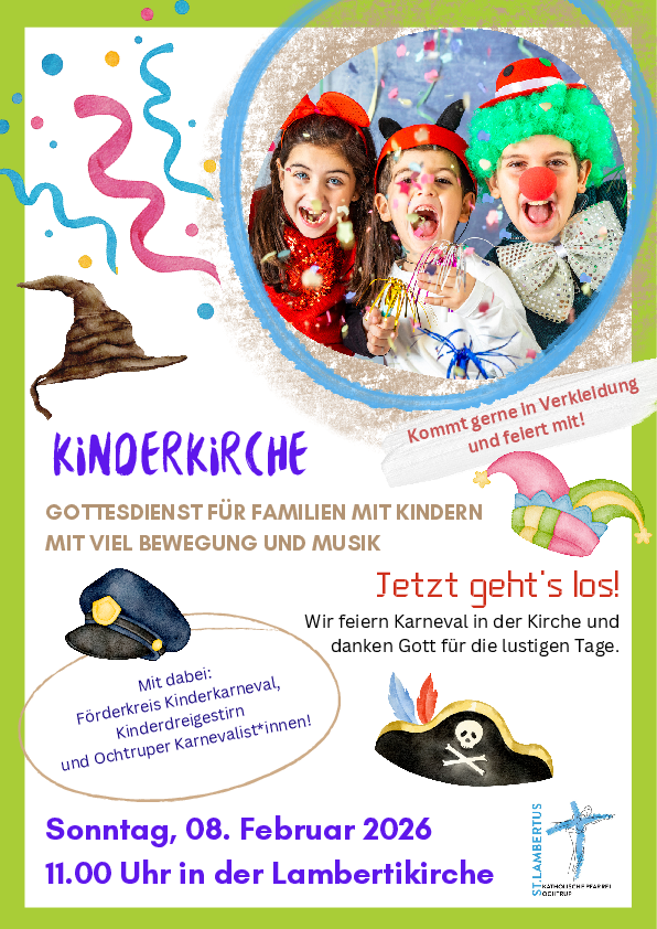 Am Sonntag, 08. Februar feiern wir Karneval in der Hl. Messe um 11 Uhr in St. Lamberti. Das Team der Kinderkirche gestaltet den Gottesdienst mit viel Bewegung und Musik besonders für Familien mit Kindern. Mit dabei sind auch der Förderkreis Kinderkarneval Ochtrup, das Kinderdreigestirn und Ochtruper Karnevalist*innen. Verkleidungen sind herzlich willkommen.
