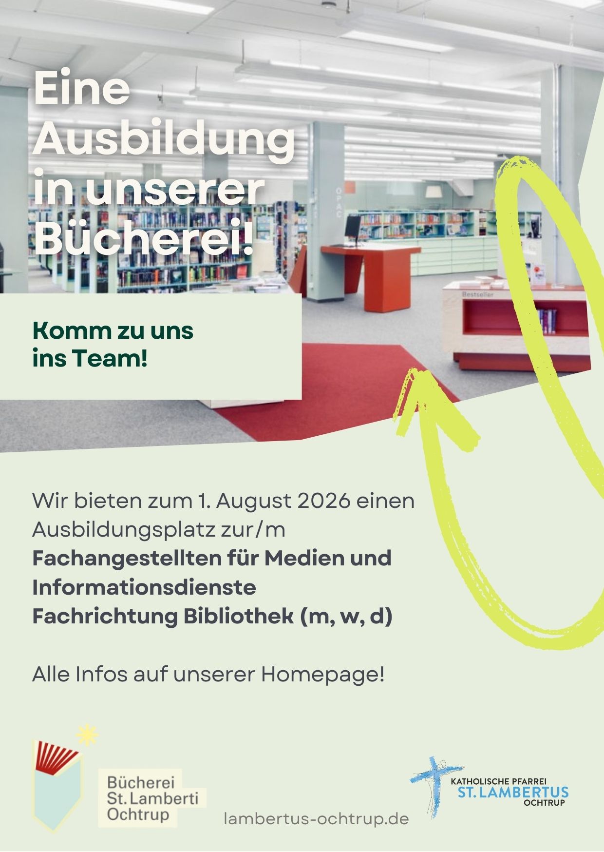 Wir bieten zum 1. August 2026 einen Ausbildungsplatz zur/m Fachangestellten für Medien und Informationsdienste Fachrichtung Bibliothek (m, w, d).