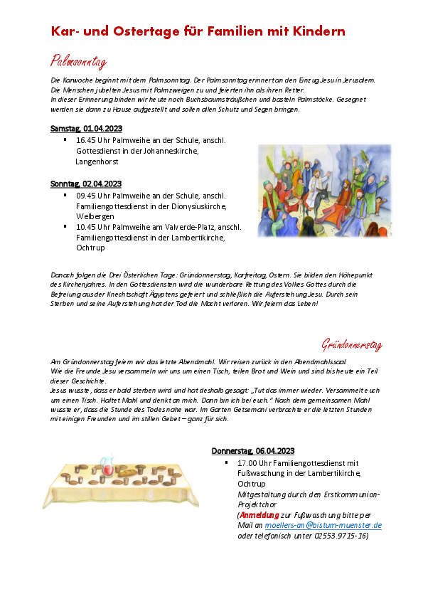 Familiengottesdienste feiern wir an jedem Sonntag um 11.00 Uhr in St. Lamberti. Diese sind so angelegt, dass die Kinder, die mit zum Gottesdienst kommen eine kleine Aufgabe bekommen und so aktiv am Gottesdienst teilnehmen können. An Heiligabend gibt es natürlich Familiengottesdienste in St. Marien (mit Krippenspiel), St. Lamberti und St. Dionysius. Dazu kommen Krippenspiele für kleinere Kinder mit Familien sowie die Offenen Kirchen.