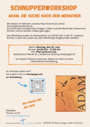 Am Samstag, den 25. Oktober 2025 um 19.30 Uhr ist es endlich so weit: Nach intensiven Proben und mit großer Vorfreude wird das außergewöhnliche Theater-Oratorium „ADAM“ von Gregor Linßen in der St. Lamberti Kirche in Ochtrup aufgeführt.