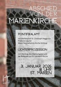 Am Samstag, 31. Januar, feiern wir um 18.00 Uhr die Profanierung der Marienkirche mit einem Gottesdienst, dem Weihbischof Dr. Christoph Hegge vorstehen wird.